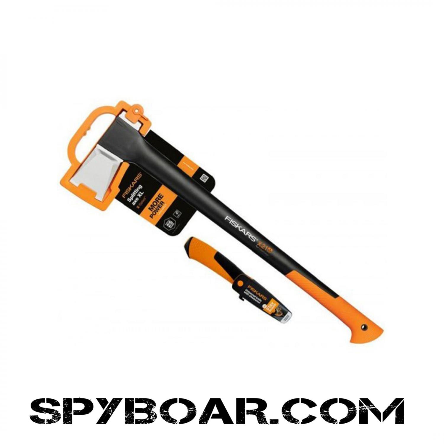 Handy axe size especially for splitting smaller quantities of fresh wood or occasional use and Fiskars Universal knife with sharpener is a utility knife with a high-quality steel quality blade for general use